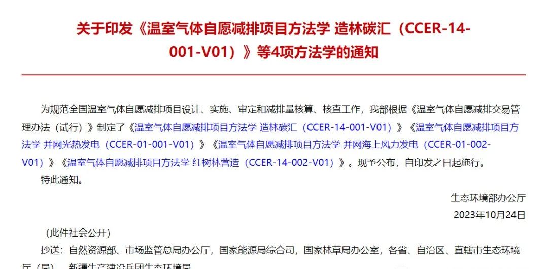 生态环境部发布4项温室气体自愿减排项目方法学